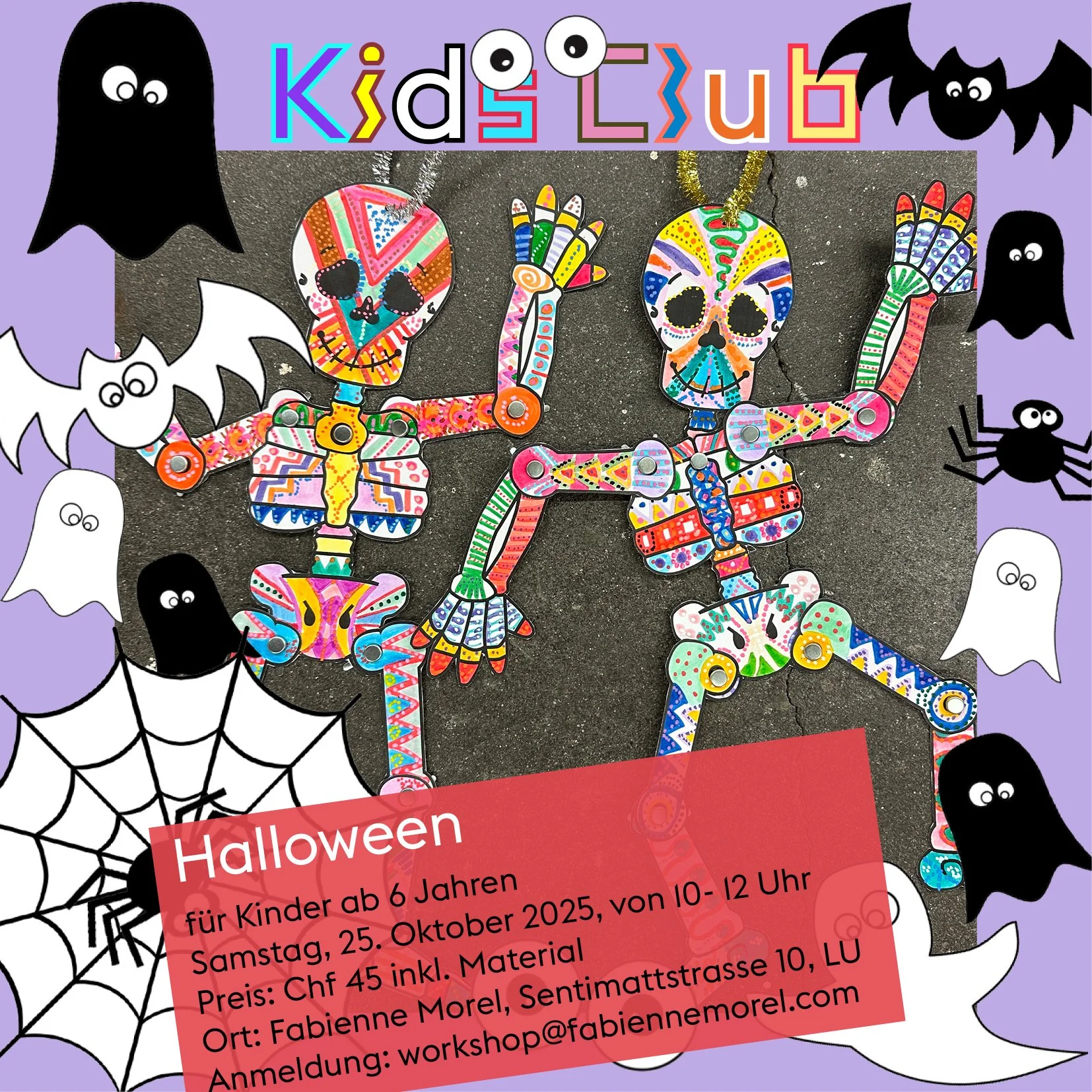 Im Kids Club wird’s kreativ und ein bisschen schaurig! Wir basteln ein Skelett – ganz nach Lust und Laune herzig, süss, schalkig oder gruselig. Dazu gestalten die Kinder ihre eigene Tasche zum Sammeln von Süssigkeiten.