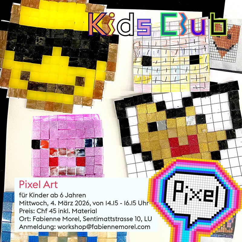 Im Pixel Workshop entdecken Kinder, was ein Pixel ist und wie Bilder aus vielen kleinen Teilen entstehen. Mit Mosaiktechnik, Farben und Formen basteln sie ihre eigene Pixelmotive. Im Mittelpunkt stehen freies Gestalten, Experimentieren und die Freude am kreativen Arbeiten. Die entstandenen Pixelbilder dürfen die Kinder mit nach Hause nehmen.